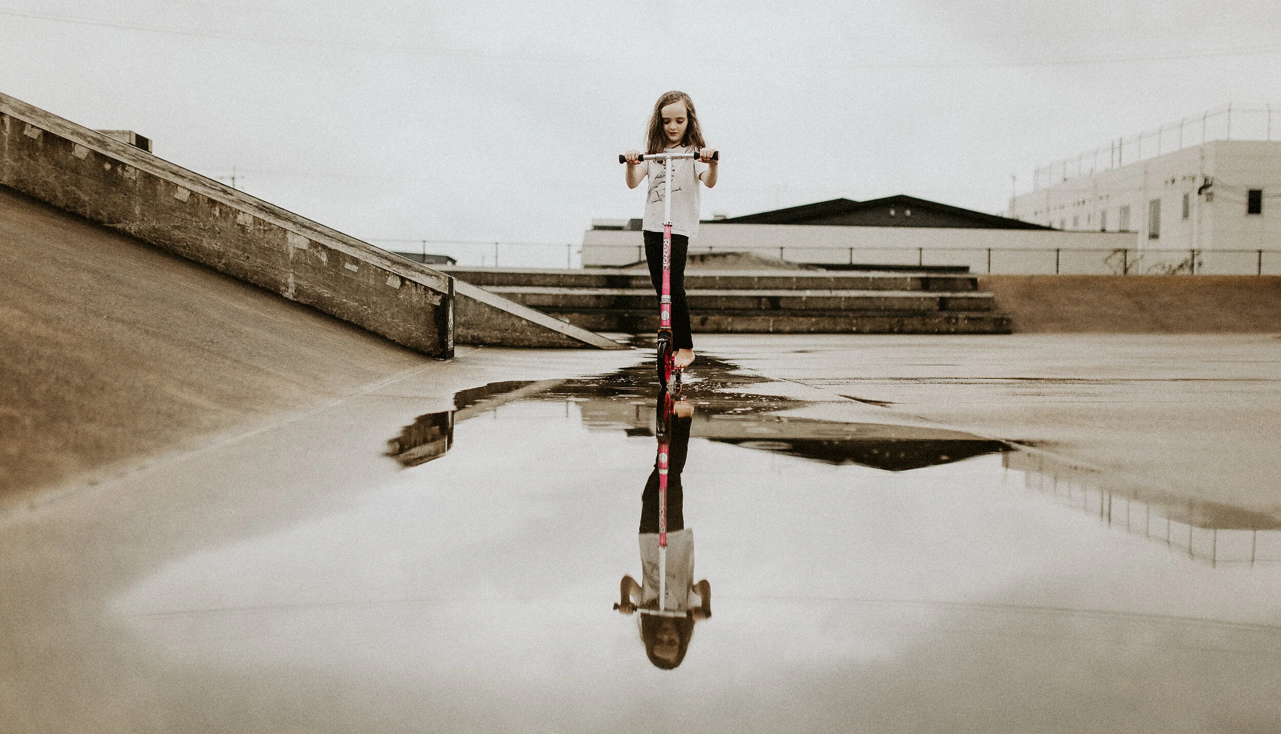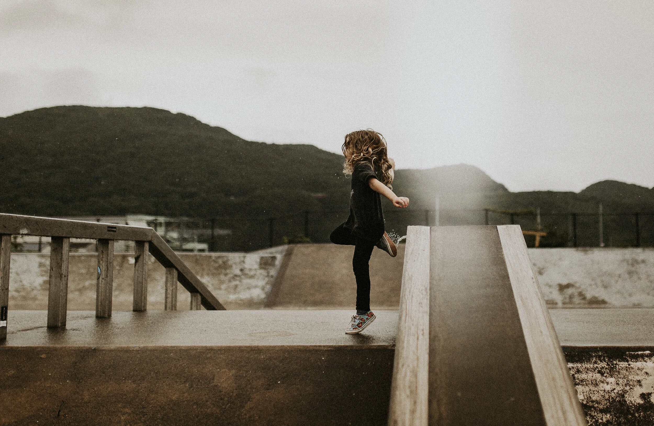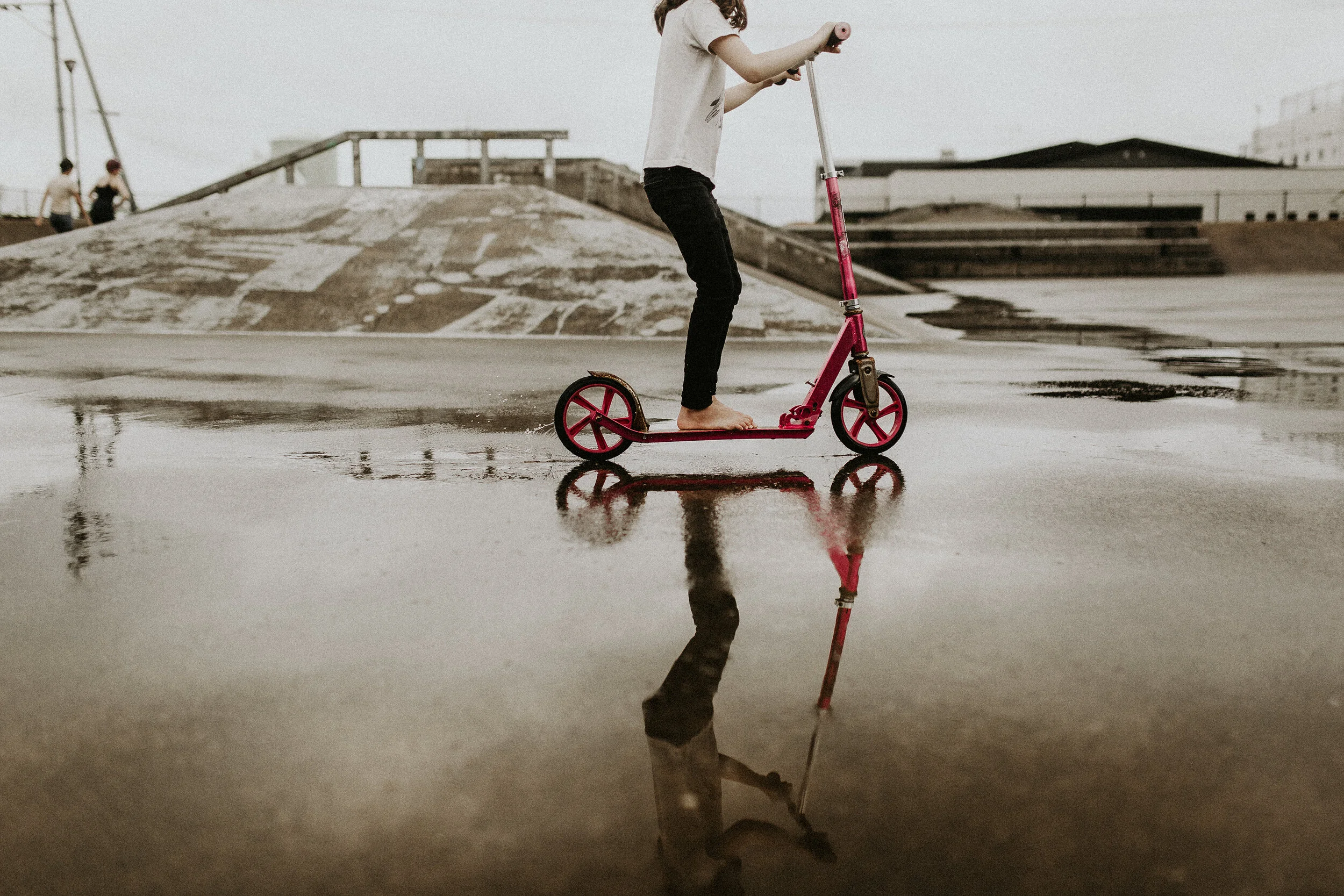 Tea also showed her little dare-devil self, running to the tops of the ramps, skateboard in hand… She scootered around, zoomed through puddles, barefoot and wild. Story joined in with water splashing and telling her tales, dancing in the rain.