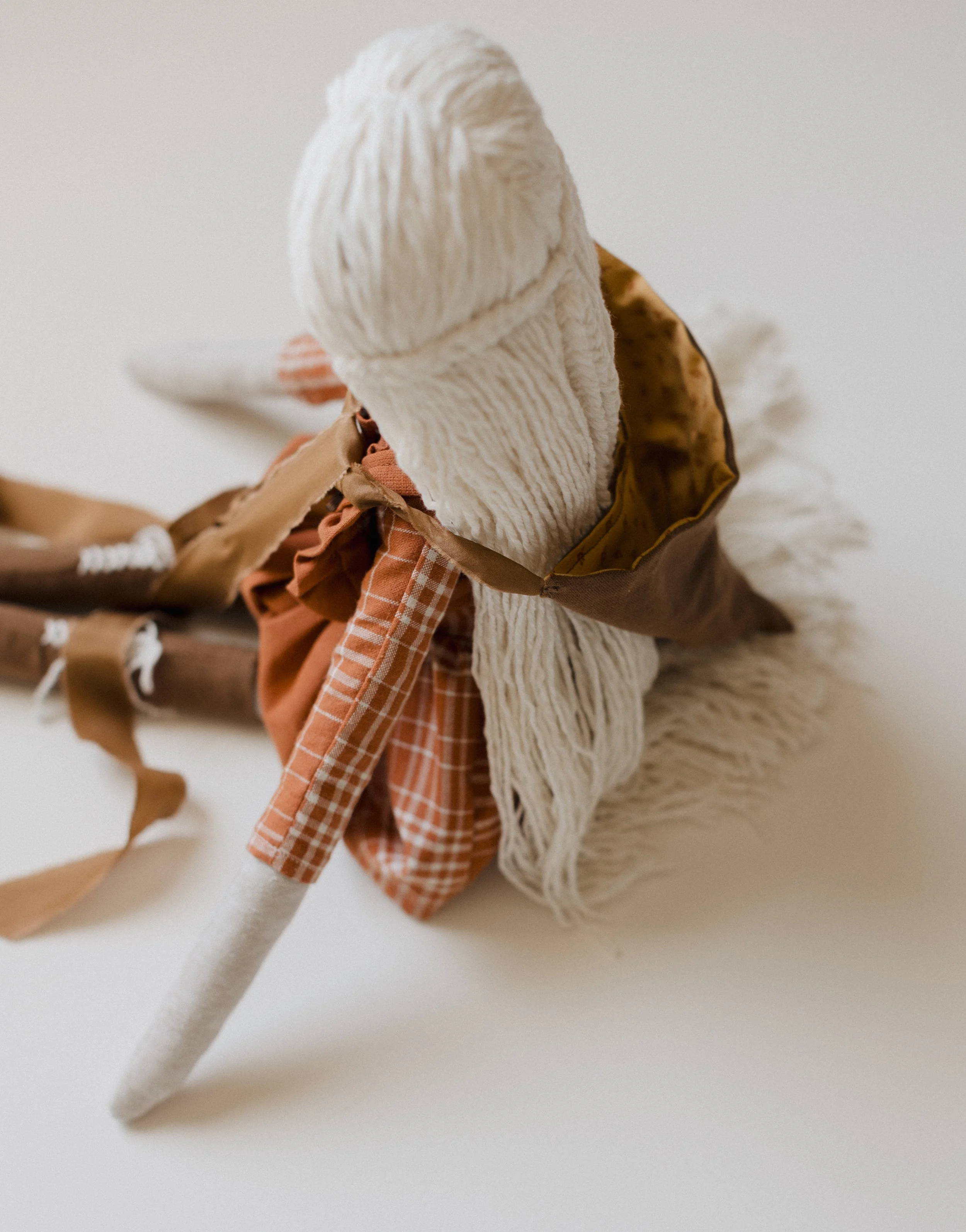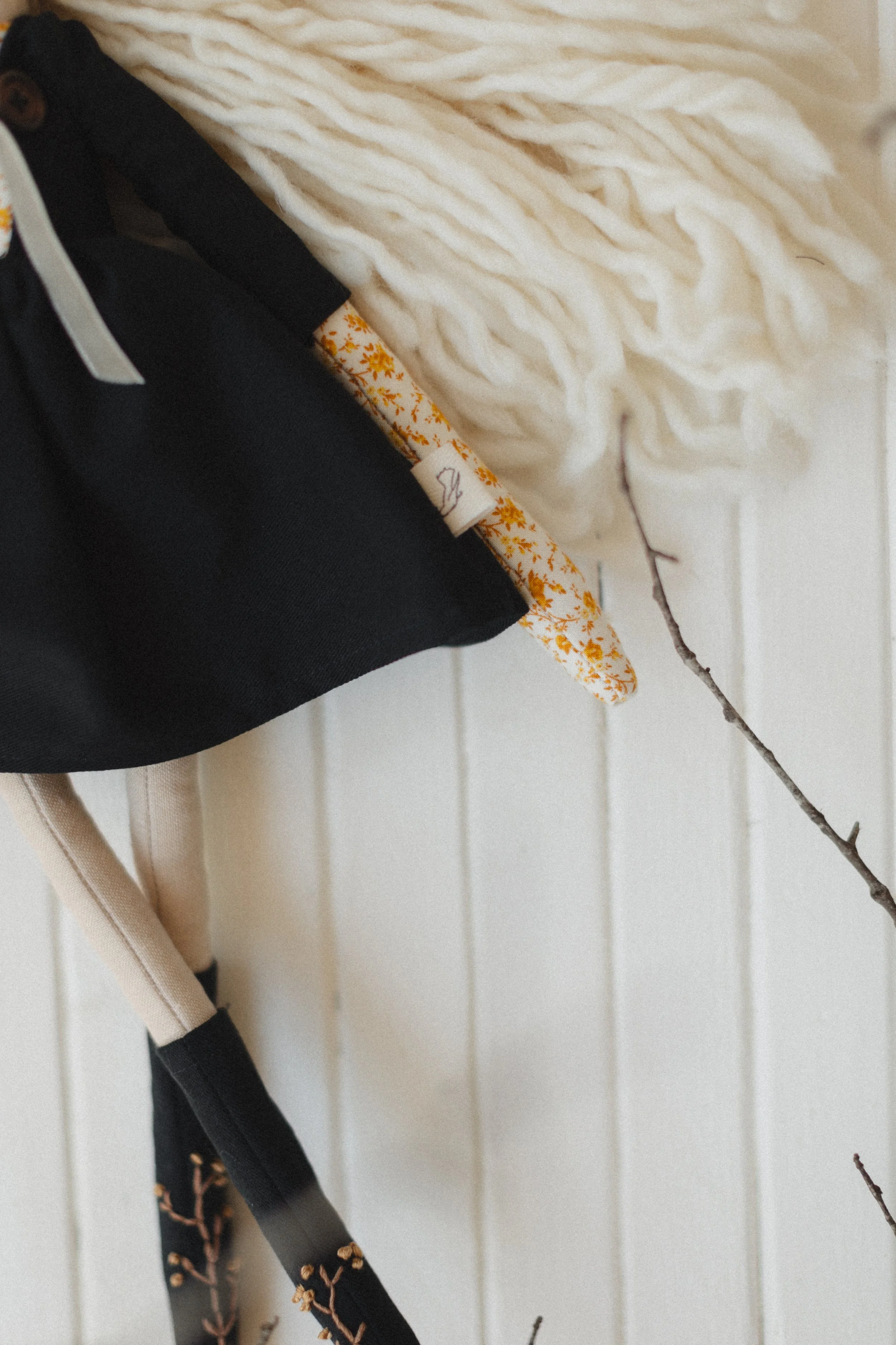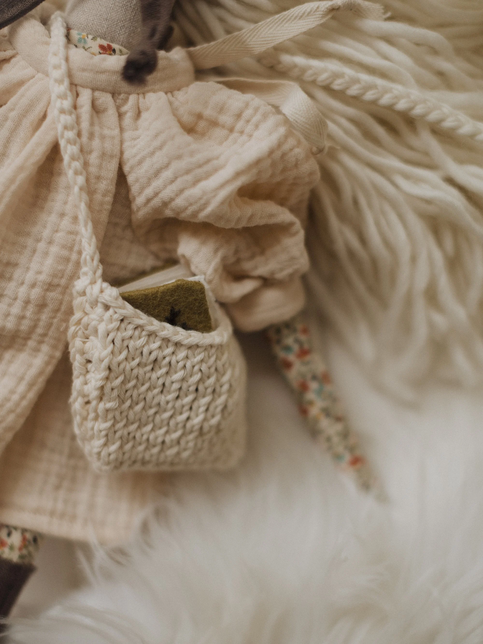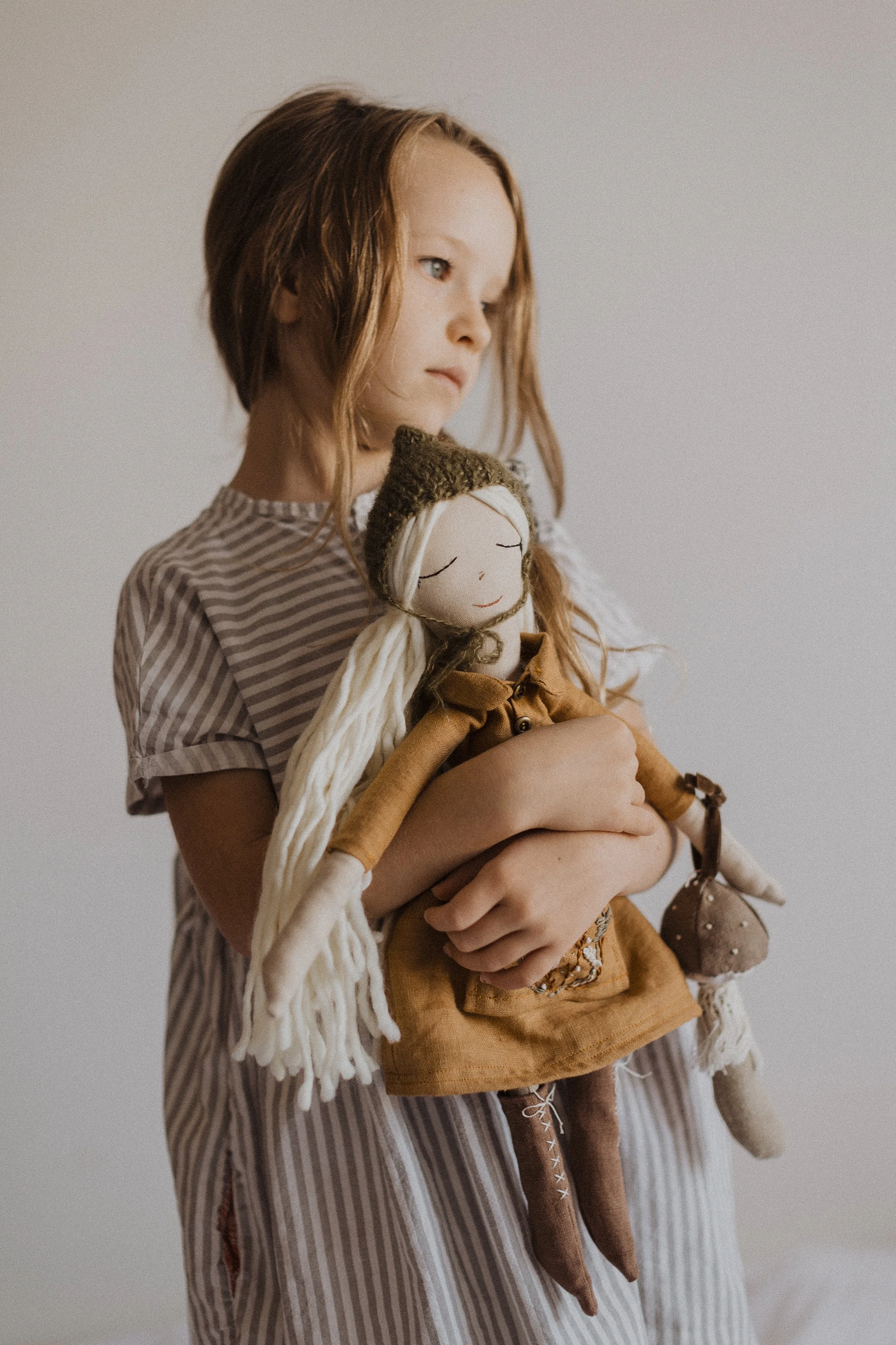 Each Doll is OOAK—- I use the materials I have sourced from Organic//Natural//Ethical Shops… All toys are stuffed with Raw/Organic cotton! I use wool yarns from Small Farms, and do my best to keep all that plastic away… Some pieces will in-cooperate plant dyed linens or cottons I have made right here with my girls— <3