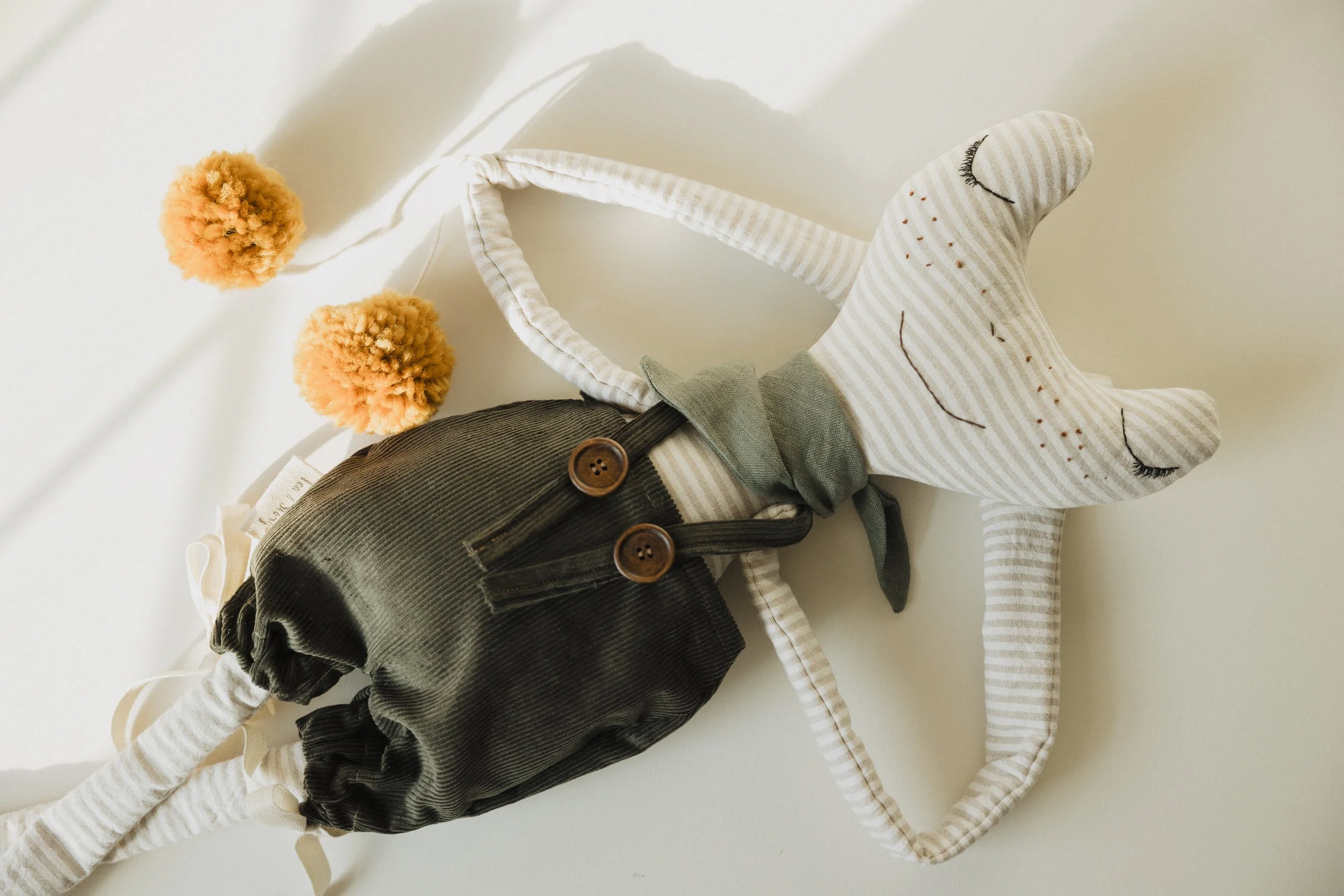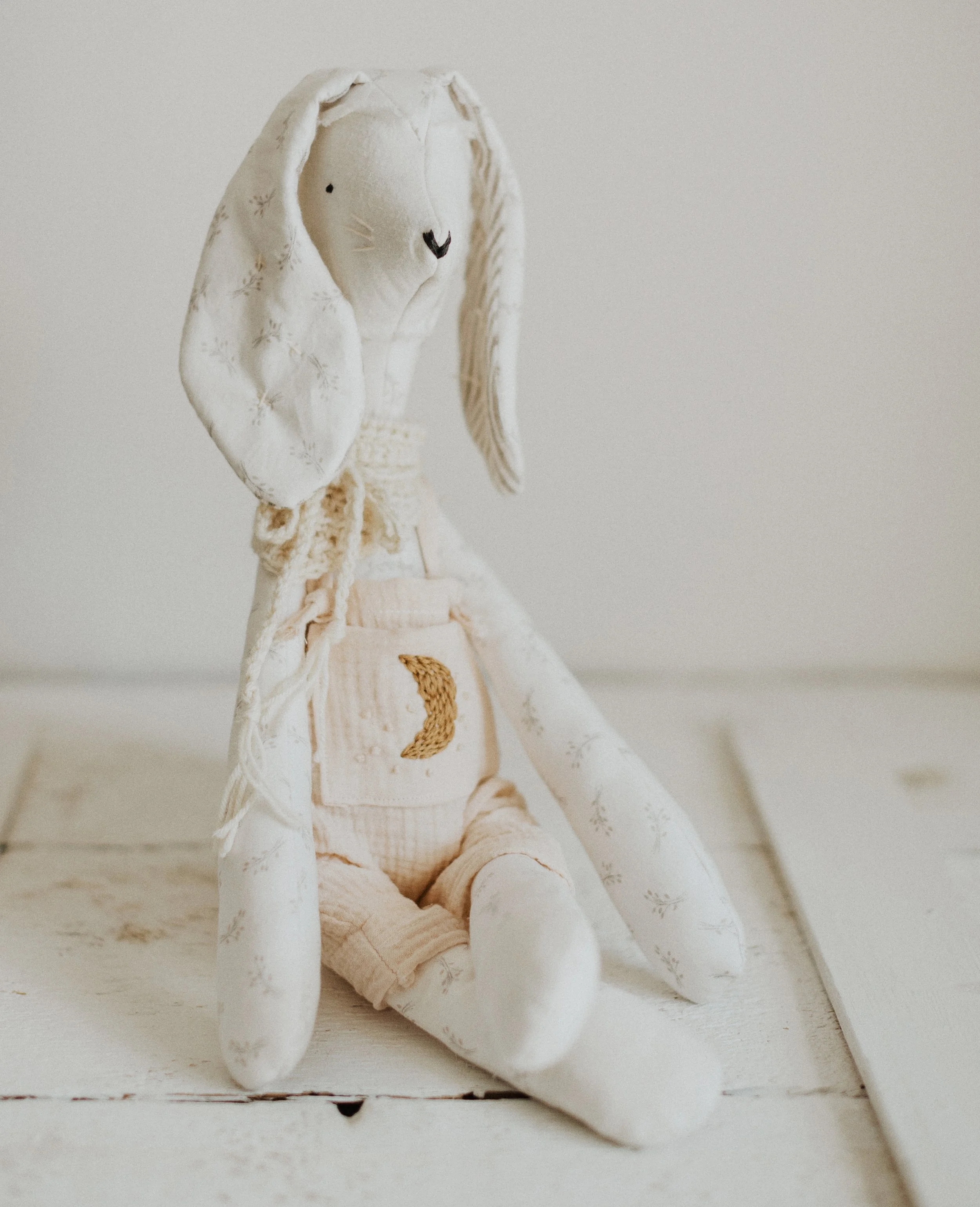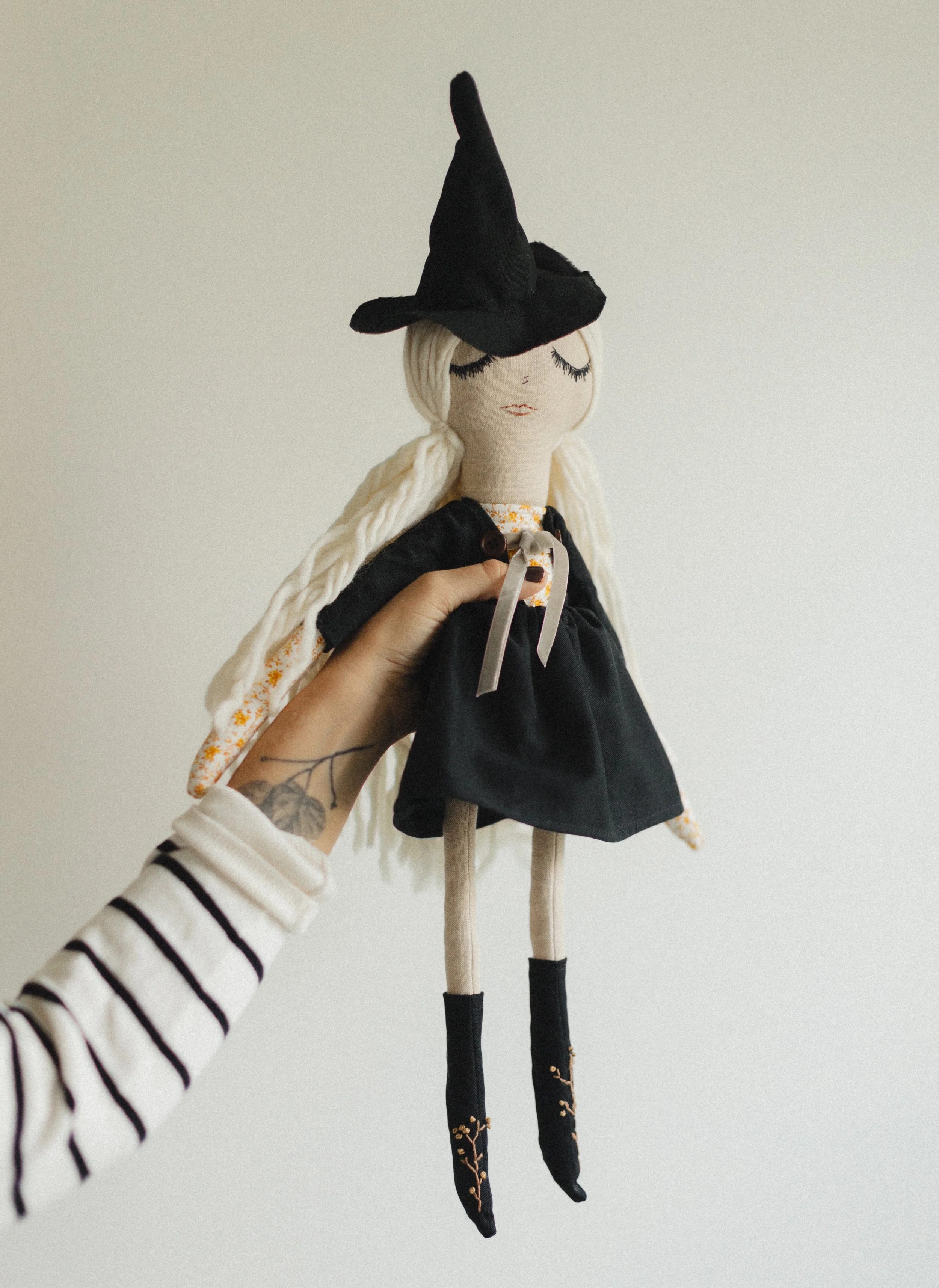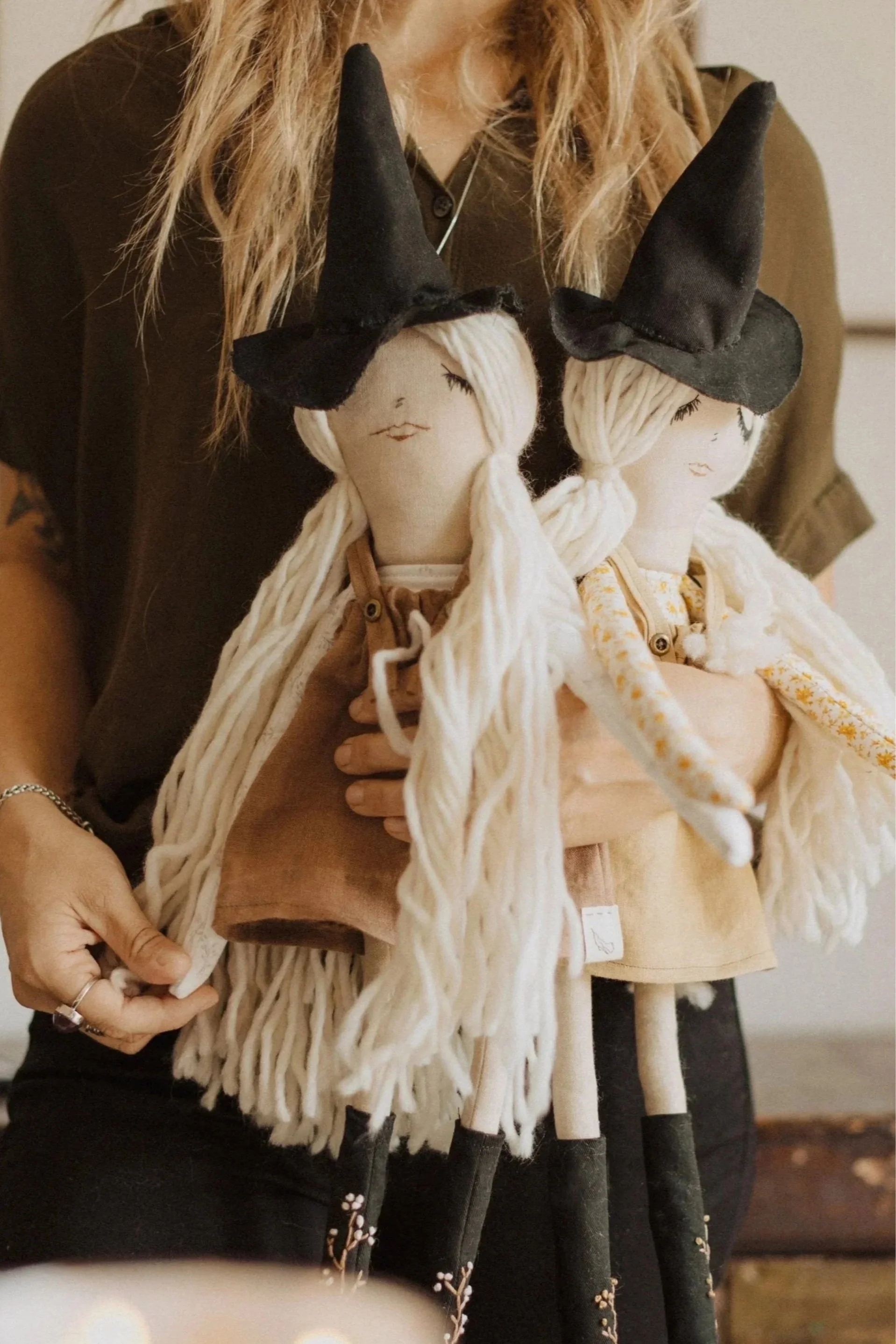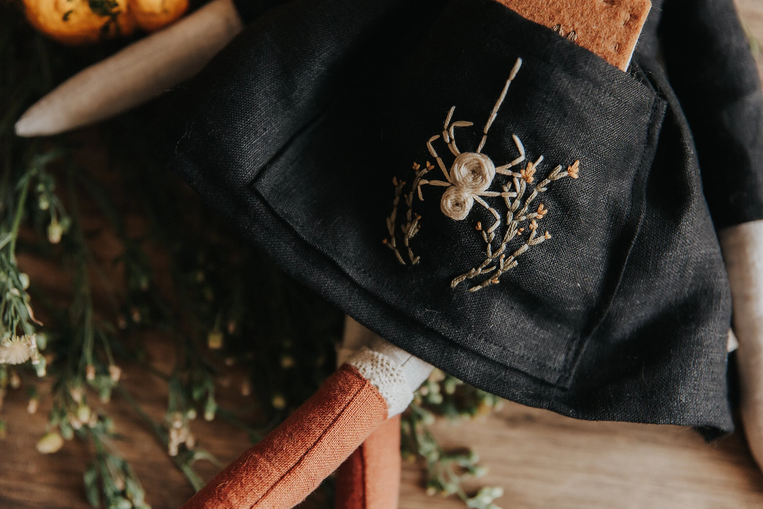 Each Doll is OOAK—- I use the materials I have sourced from Organic//Natural//Ethical Shops… All toys are stuffed with Raw/Organic cotton! I use wool yarns from Small Farms, and do my best to keep all that plastic away… Some pieces will in-cooperate plant dyed linens or cottons I have made right here with my girls— <3